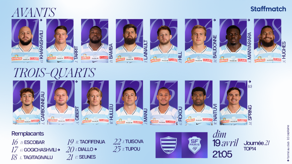 La composition du Racing 92 face au Stade Français pour la 22ème journée de TOP 14 à Paris La Défense Arena